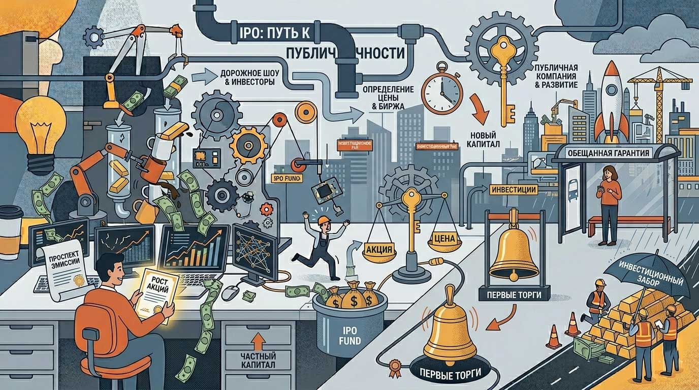 Ниже представлено изображение, которое метафорически иллюстрирует процесс трансформации компании: от закрытого роста до публичного процветания. На нем показаны ключевые этапы: работа команды, подготовка документов с инвестбанком, волнительный момент определения цены и, наконец, успешный старт торгов на бирже, где капитал превращается в реальные возможности.